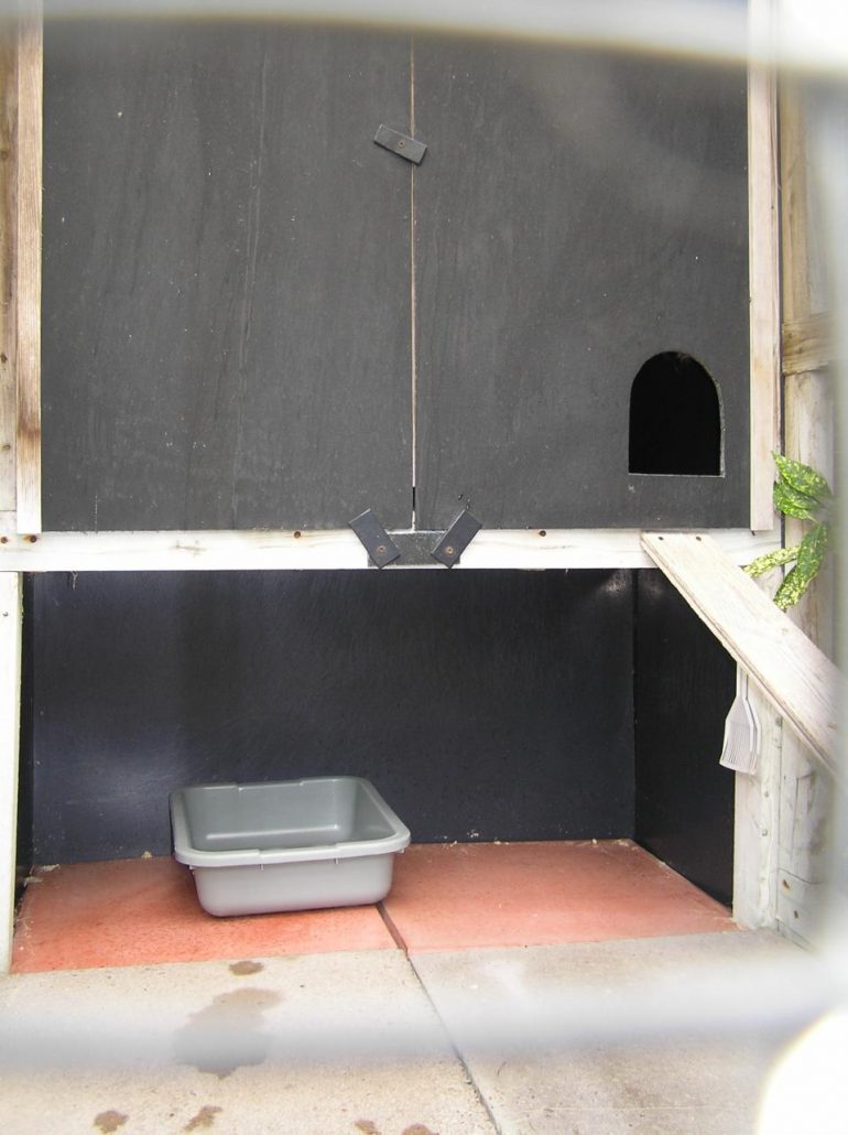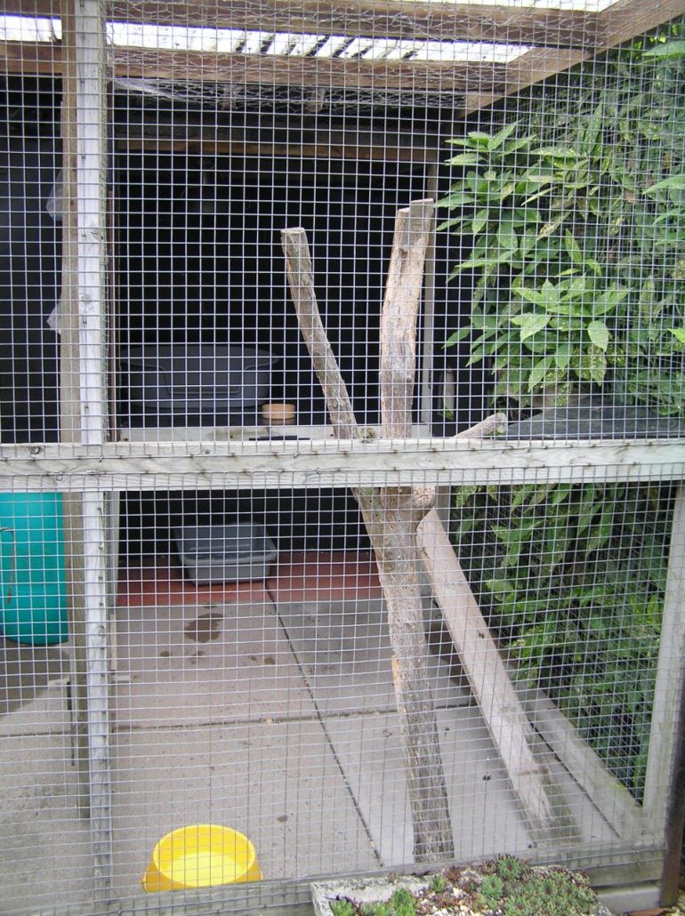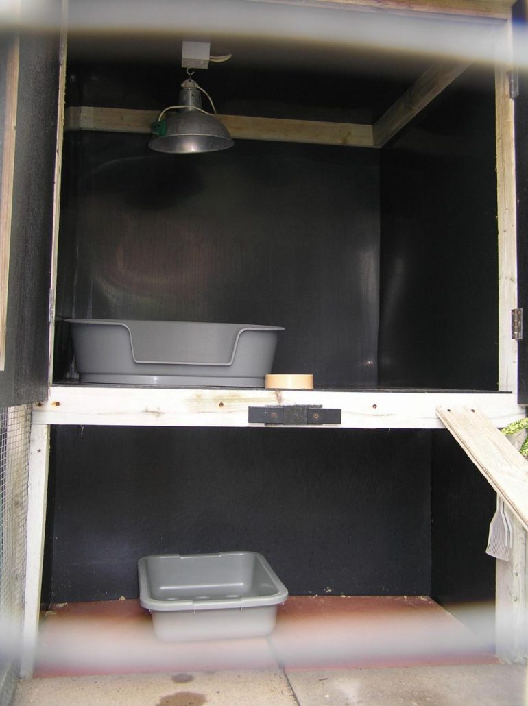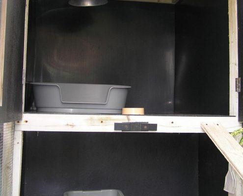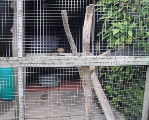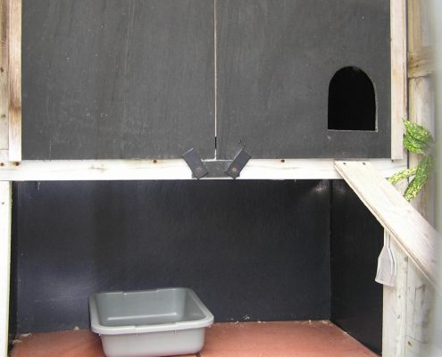 A litter tray is under the bed area and they have access to their own large outside play area at all times. This has a sun shelf and climbing ‘tree’ for play.